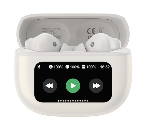 The charging case includes a color HD display showing individual earbud battery levels, mode indicators, and more—no guessing required.